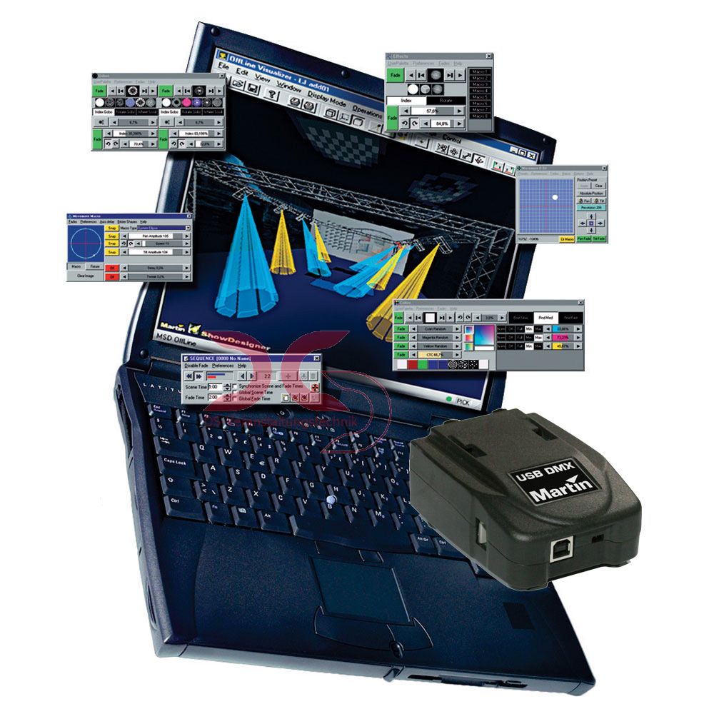Laptop mit Martin Lightjockey 2-Software und USB DMX Adapter